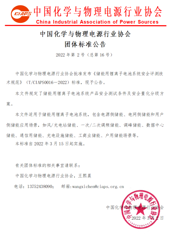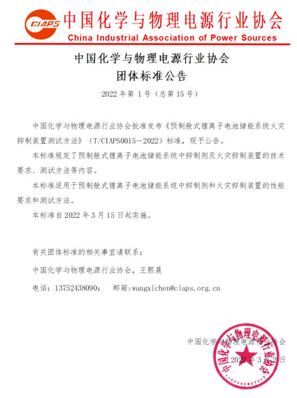 日前,中国化学与物理电源行业协会发布团体标准(以下简称“团标”)公告,批准科华参编的《预制舱式锂离子电池储能系统火灾抑制装置测试方法》(T/CIAPS0015―2022)、《储能用锂离子电池系统安全评测技术规范》(T/CIAPS0016―2022)标准发布,定于2022年3月15日起实施。